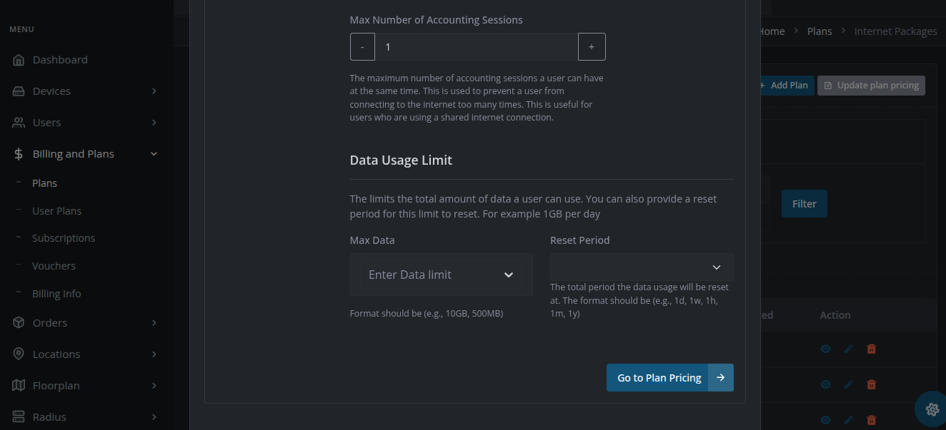 Click on the "Go to Plan Pricing" button to save the plan limits
